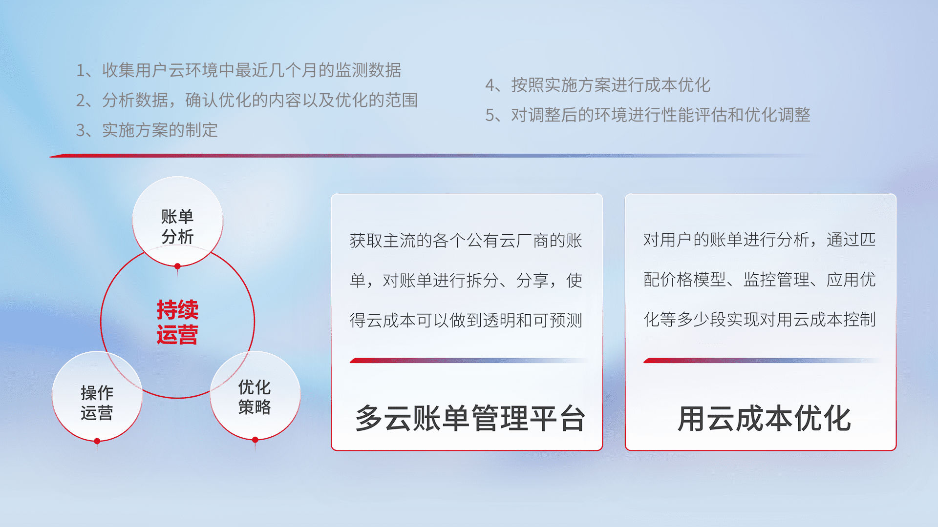 通过多云纳管,,,,以统一的资源数据模型把客户的云资源进行抽象和封装,,,,进而实现对多云资源的统一操作,,,,保障云资源管理的可靠性、、、、稳定性与可用性。。。量身定制化运维内容,,,,配置、、、、开发运维、、补丁管理、、、备份、、、监控、、、、认证和访问管理、、、审计和日常巡检等,,保障在用云过程中的可靠度,,稳定度以及高可用率。。。